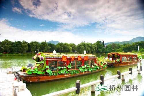 藝術節期間,首次在西湖湖面上配置6艘荷花花船,極大地提高了荷花節的觀賞性和趣味性,成為西湖中一道流動的荷花美景。其中,由杭州市園林綠化股份有限公司設計制作的“魅力西湖”荷花游船,將插花技藝與園林布景手法有機結合,用康乃馨、勿忘我、太陽花等與荷花組景,既突顯了“主角”荷花的秀麗、典雅,又使整艘船的色彩明艷豐富,將熱鬧的節日氛圍巧妙烘托。