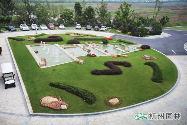 2號樓大廳門前,在大面積的草坪上,選用紅花檵木、金邊胡頹子、茶梅等一些小毛球,用中國書法的用筆法則,十分簡潔地“書寫”出點、橫、豎、鉤、提、撇、短、捺,即代表中國書法中筆畫大體的“永”字八法,傳達出“大道至簡”的書法精髓。這種匠心獨運的植物配置,將園林的造景手法與中國書法藝術完美配合,景觀效果令人耳目一新,使項目的整體景觀品位得到了質的提升,是中國傳統園林造景手法的典型運用。