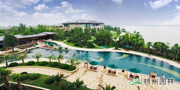 如今,走進吳江東太湖溫泉度假酒店,開闊大氣的入口景觀,整齊劃一的行道樹,道路兩側花境式的植物組團,首先帶給人一種高端、原生態的感覺。隨著蜿蜒的園路不斷延伸,更多的園林美景一一呈現:開闊的草坪起伏有致,自然式的花境布置清新雅致,造型獨特的黑松、女貞盡顯莊嚴華貴,婚禮草坪處處充滿浪漫氣息,露天泳池彌漫著濃郁的熱帶風情,溫泉泡池區懷舊氣息撲面而來,湖邊的觀景平臺則將自然美景盡收眼底……大氣中盡顯華貴雍容,細節中隨處可見精致品味,文化氣息處處流轉,自然美景比比皆是,園林與建筑渾然一體?!半m由人作,宛自天開”,是對該項目最凝煉的贊譽。