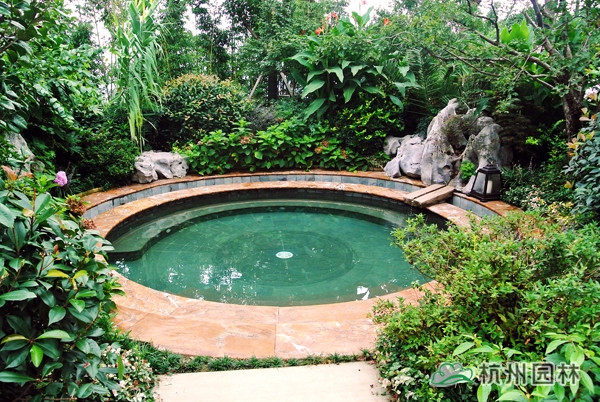 五千年的中國歷史文化,恢宏浩瀚,為園林造景提供了取之不竭的素材;園林景觀,也因為傳承了深厚的文化底蘊而散發出獨特的藝術魅力。作為一個旅游度假項目,對園林景觀的要求,不僅僅只是精致大氣、風韻天成的美景,更需要有深厚的文化底蘊,彰顯獨一無二的中國元素。為此,在2號樓大廳門前,用植物造景再現代表中國書法中筆畫大體的“永”字八法,彰顯中國書法的魅力;在泡池的建造上,運用老石碾、壓門石、老磨盤等老石材,打造出懷舊氣息濃郁的鄉土風情。