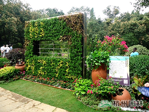 走進畫境園,只見主入口左側種植著兩株一高一矮的厚皮香樹,郭昌如笑著說,“這兩棵厚皮香寓意的是兩個萬分自豪的森林衛士——熊大和熊二,你看,熊二還滿臉熱情地向游人不停地招手示意呢?!敝魅肟谟覀仁且幻媪Ⅲw綠植墻,所用的植物主要為黃金絡石、金寶石冬青、小葉梔子花、金邊黃楊等?!傲Ⅲw綠植墻是立體綠化的主要形式,畫境?青山湖花園中心推出的這款立體綠植墻產品,可以根據客戶需要,結合氣候、溫度、濕度、色彩等綜合條件,選配四季長綠或色彩豐富的植物,隨時在人們想要的地方構建出一個貼近自然又超脫自然的生活環境,可謂是簡單又方便?!惫缃榻B道。立體綠墻的兩側,隨意地散落著一些紅陶罐,與金寶石冬青、龜甲冬青等精品球形植物,三角梅、月季、常春花、雞冠花等花卉,紫葉狼尾草、晨光芒、矮蒲葦等觀賞草混搭,營造出一種溫暖、和煦的庭院景觀?!叭绻丫G植墻看成是城市的建筑,此景則喻意美麗杭城的繁華一角?!惫缪a充說。綠植墻的中間還別出心裁地設置了一扇窗戶,透過它,園內的美景已隱約可見。