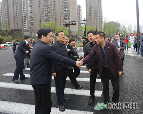 4月7日上午,浙江省委常委、杭州市委書記趙一德,杭州市委副書記、市長張鴻銘等市四套班子帶領各區(qū)縣及相關部門負責人,冒雨檢查新塘路綜合整治工程情況。杭州市園林綠化股份有限公司總裁張炎良陪同前往。