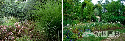 入口視線落腳點(diǎn)以粉黛亂子草+大濱菊花帶為中景,以紫絨鼠尾草+亞麻“紅劍”+微型月季“玫紅”為前景,在細(xì)葉芒的掩映下,將花園內(nèi)部形成若隱若現(xiàn)的效果;木香花架側(cè)采用花帶式種植,利用粉黛亂子草可達(dá)1.5m以上的枝葉進(jìn)行空間分割,形成既與周圍環(huán)境風(fēng)格統(tǒng)一又相對(duì)私密的花園獨(dú)立空間。并采用大濱菊做邊緣隔離、金線石菖蒲做填充,既限定了粉黛亂子草的生長(zhǎng)區(qū)域,又增加了景觀多樣性。