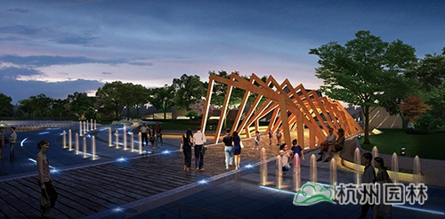 水岸廣場:臺地張弛有度,將臺階、坡道、草坪、木平臺、廣場組成豐富的濱水空間,流線型的岸線貫穿整個臺地,形成一條觀光濱水走廊,結合濱水岸線設置游船碼頭、親水平臺,形成極具特色的水岸廣場。