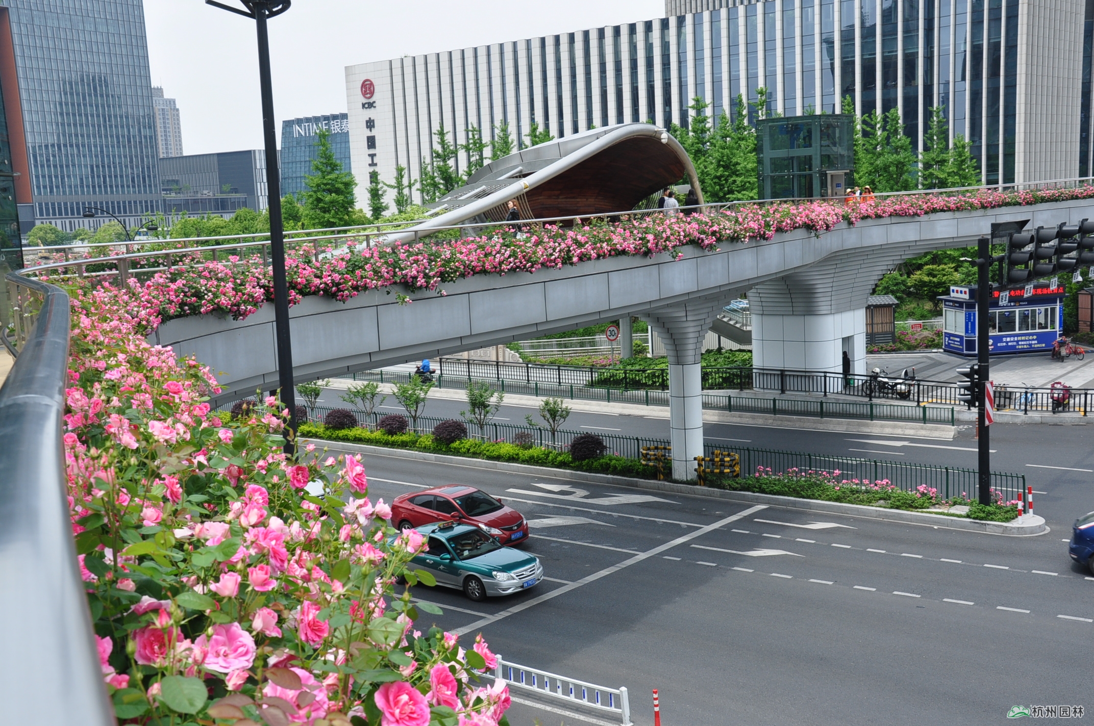 位于新塘路和慶春路交叉口的慶新天橋是新塘路綜合整治工程的標志性建筑之一,也是杭州首座仿生態學原理的異形人行天橋。橋面獨特的景觀造型宛如一條風景秀美的彩色飄帶,大量月季沿橋面外側護欄種植,月季花盛開時節,橋面仿佛戴上了一條色彩絢麗的花環,美不勝收,充分體現了杭州包容、大氣、開放的時代風貌、都市氣質和國際視野。