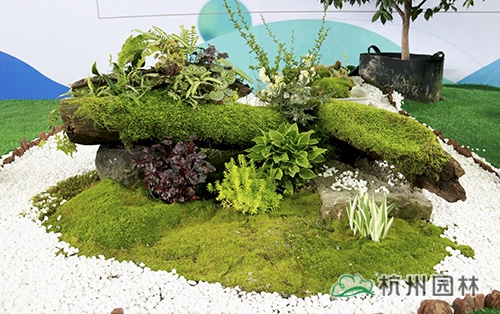 現場共布置了四個小場景,前方左側以自然形狀的植物造景為主,通過各種花開植物與常綠、色葉等植物的巧妙搭配,展現庭院中向陽處的植物應用和景觀效果;前方右側以各種塔形、圓形、方形、球形等造型植物為主,通過高低錯落的有機布置,展現各種造型植物在景觀中的應用效果;后方左側以松磷堆疊出地形,用佛甲草圍合,以金鐘花、月桂等植物點綴,展示庭院一角的造景效果;后方右側則是一處苔蘚微景觀,以白石子鋪底,通過枯木、苔蘚、礬根及豐富的蕨類植物等的搭配,配以起伏的地形,營造出一片寧靜清新的小森林般的陰生景觀。