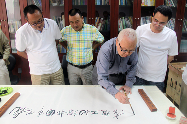 孫老不僅是一位園林規劃設計專家,同時也是一位書畫名家,他曾師從徐悲鴻、孫多慈教授學畫,具有很高的藝術修養。在我們的邀請下,孫老欣然提筆,寫下了“杭州市園林綠化工程有限公司”、“易大景觀”等公司名稱,以及“天然圖畫”、“造化為師”等題詞,以精準的語言凝煉了他對園林行業的看法,寥寥數語中,讓我們深受啟發。行云流水的筆法、流暢飽滿的線條,每一幅題字都一氣呵成,每一幅題字都是一幅藝術畫。每幅題字寫完,大家都會報以熱烈的掌聲,孫老對園林的深刻見解及深厚的書法功底令我們深深折服。
