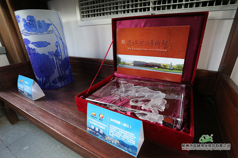 在以浙派民居為風格的主題建筑“富春山居”內,展示著來自仙居的無骨花燈、溫嶺的石雕、黃巖的翻簧竹雕、椒江的臺州玻雕、臺州刺繡等精美的展品。