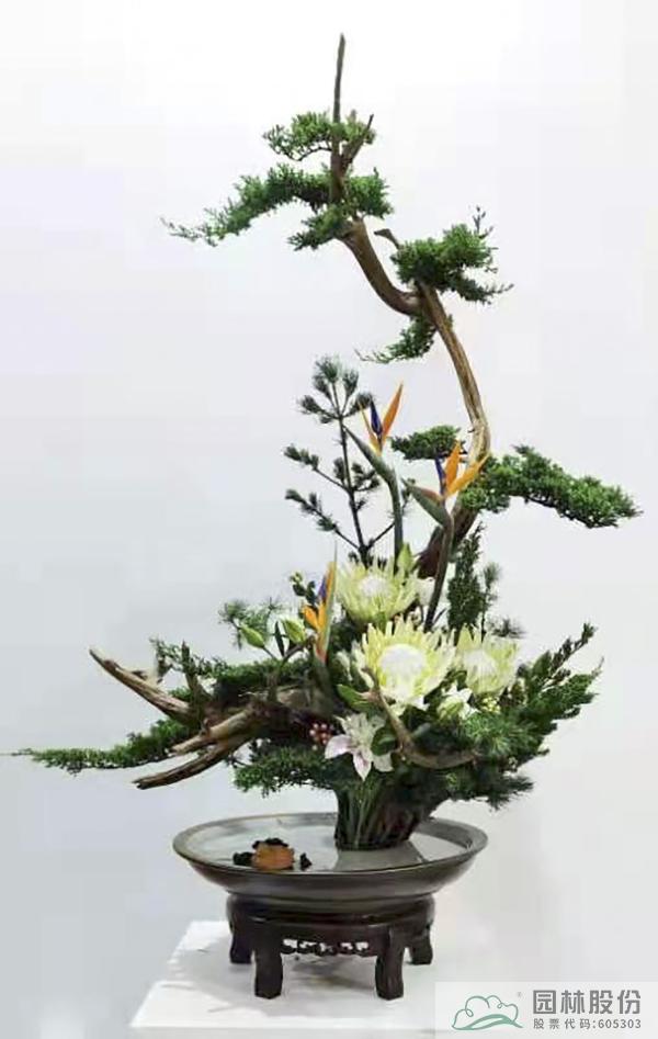 另有極富意境的《云崖青嶠》插花作品,選崖柏、龍柏、鋪地柏、五針?biāo)伞⒌刍驶ā⒅匕臧俸匣ā⒎凵桶咨鸾z桃、天堂鳥,以成云崖青嶠之作。云為雅意,崖寓故訓(xùn),青色入觀,嶠在畫外。如此,松風(fēng)若過,花開舒卷,青紅果結(jié),臨水照影。清澗之曲,碧松之陰,相映成趣,著手成春矣。