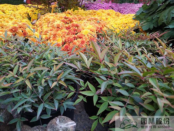 將樹型精致的灣流南天竹點植在低矮的高飽和度球菊花叢中,通過色彩與形態的對比,成為視覺焦點。