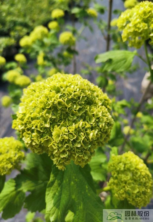 忍冬科莢蒾屬,落葉灌木。葉三裂,秋色葉紅色。聚傘花序,全為不孕花,花大且繁,花色初開(kāi)綠色,萌萌如綠豆糕,后逐漸變純白。植株萌芽力強(qiáng),耐寒耐熱,可耐-30℃低溫。生長(zhǎng)迅速,適合庭院觀賞。
