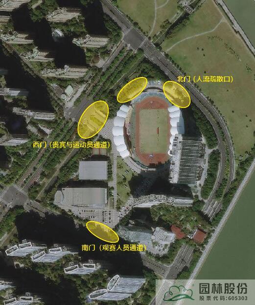 ① 西門(貴賓與運動員通道):足球文化景觀小品+特色花境+蒔花裝點