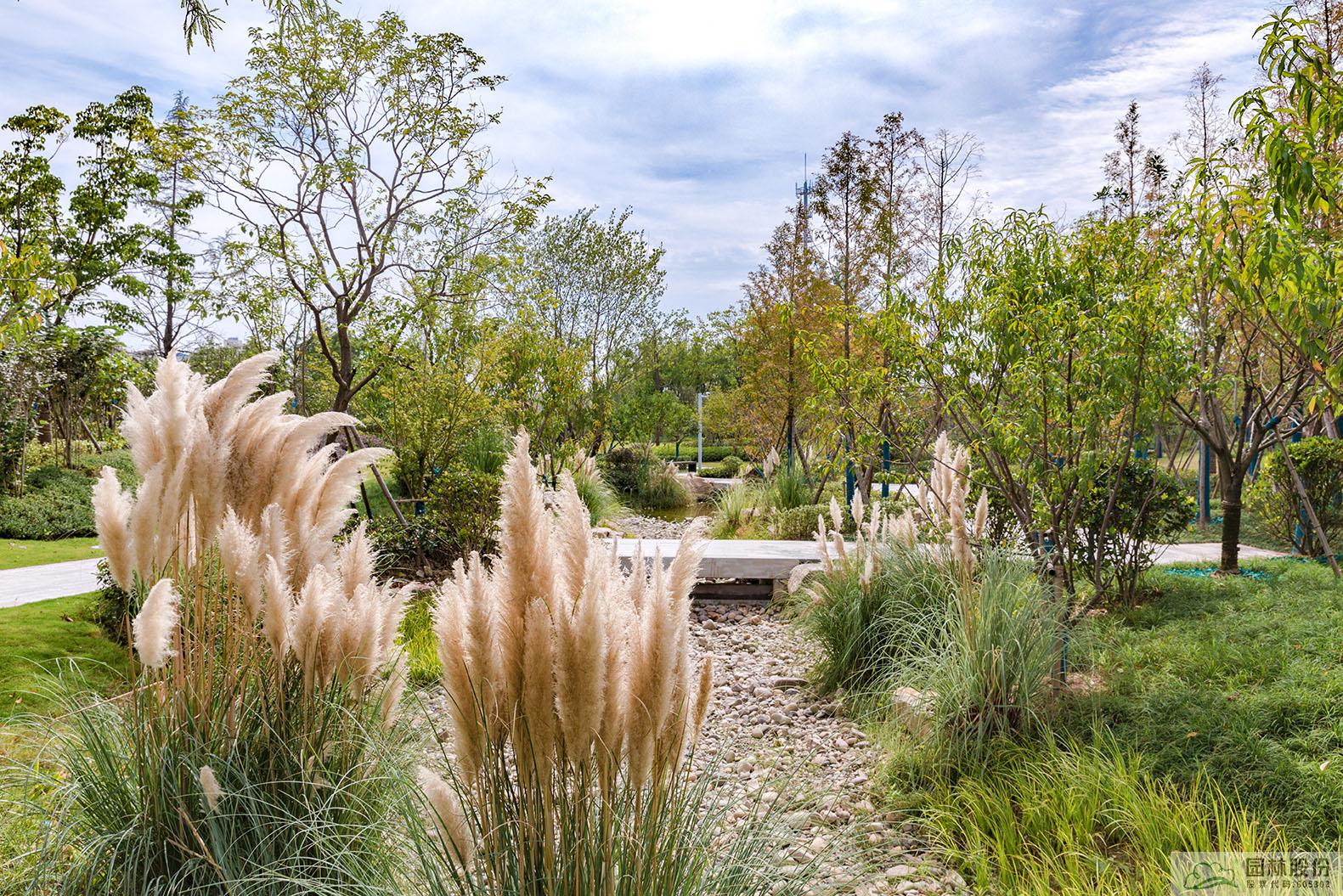 旱溪景觀同樣是海綿城市理念的應用典范,下雨時蓄水,既可用于植物的日常澆灌,又能營造出清新靈動的水景;干旱時,鋪滿鵝卵石的水底又可與周邊豐富的植物營造出另一種園林意境。
