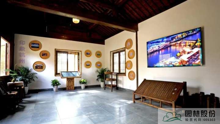 在屋內,是一個室內展廳,它以現代化數字媒體手法和圖文展板來為觀眾講述來自浙江的故事。展廳內容共有三個部分,為“印象杭州”“詩畫浙江”“美麗家園”,通過豐富的表現方式,展現了浙江發展成就,描繪了一幅鄉村振興的美好圖景。